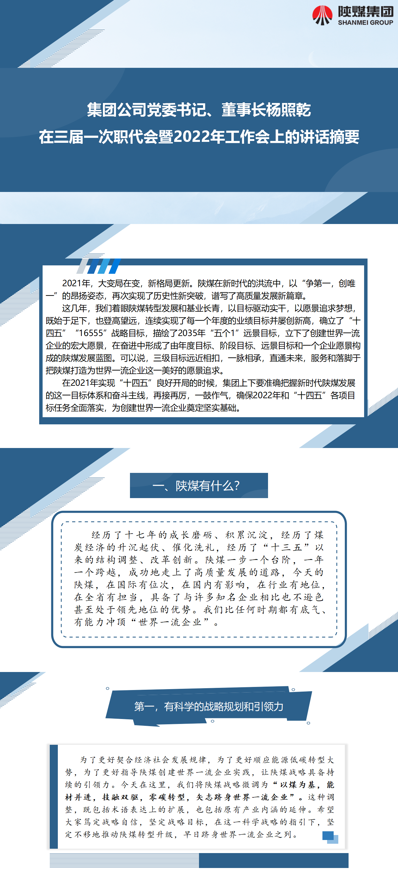 集團(tuán)公司黨委書(shū)記、董事長(zhǎng)楊照乾在三屆一次職代會(huì)暨2022年工作會(huì)上的講話摘要
