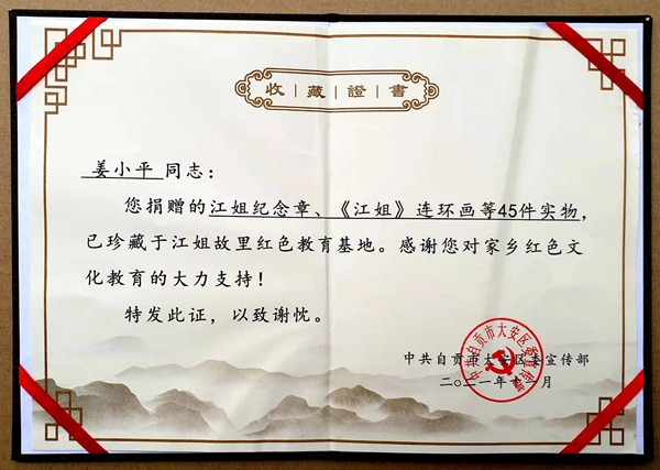 在“紅巖英烈”江姐犧牲72周年紀念日前夕,姜小平向自貢市江姐故里紅色教育基地無償捐贈了45件與江姐相關的文獻史料,讓藏品發(fā)揮應有價值,讓紅巖精神代代相傳。