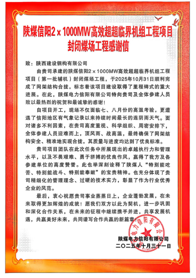 近日,陜西建設(shè)鋼構(gòu)有限公司收到陜煤電力信陽有限公司發(fā)來的感謝信,信中對建設(shè)鋼構(gòu)在承建陜煤信電2×1000MW高效超超臨界機(jī)組項(xiàng)目封閉煤場工程中表現(xiàn)的卓越的執(zhí)行力和管理水平以及不畏艱難、勇于拼搏的優(yōu)良作風(fēng)表示誠摯的感謝!感謝信指出,陜煤信陽2×1000MW高效超超臨界機(jī)組工程項(xiàng)目封閉煤場工程于2025年10月31日順利完成了網(wǎng)架結(jié)構(gòu)合攏,標(biāo)志著該項(xiàng)目建設(shè)取得了里程碑式的重大進(jìn)展。陜煤信電特向建設(shè)鋼構(gòu)全體參建人員致以最熱烈的祝賀和最誠摯的感謝!感謝信中說,自項(xiàng)目開工以來,現(xiàn)場不僅面臨七、八月份的高溫考驗(yàn),更遭遇了信陽地區(qū)有...