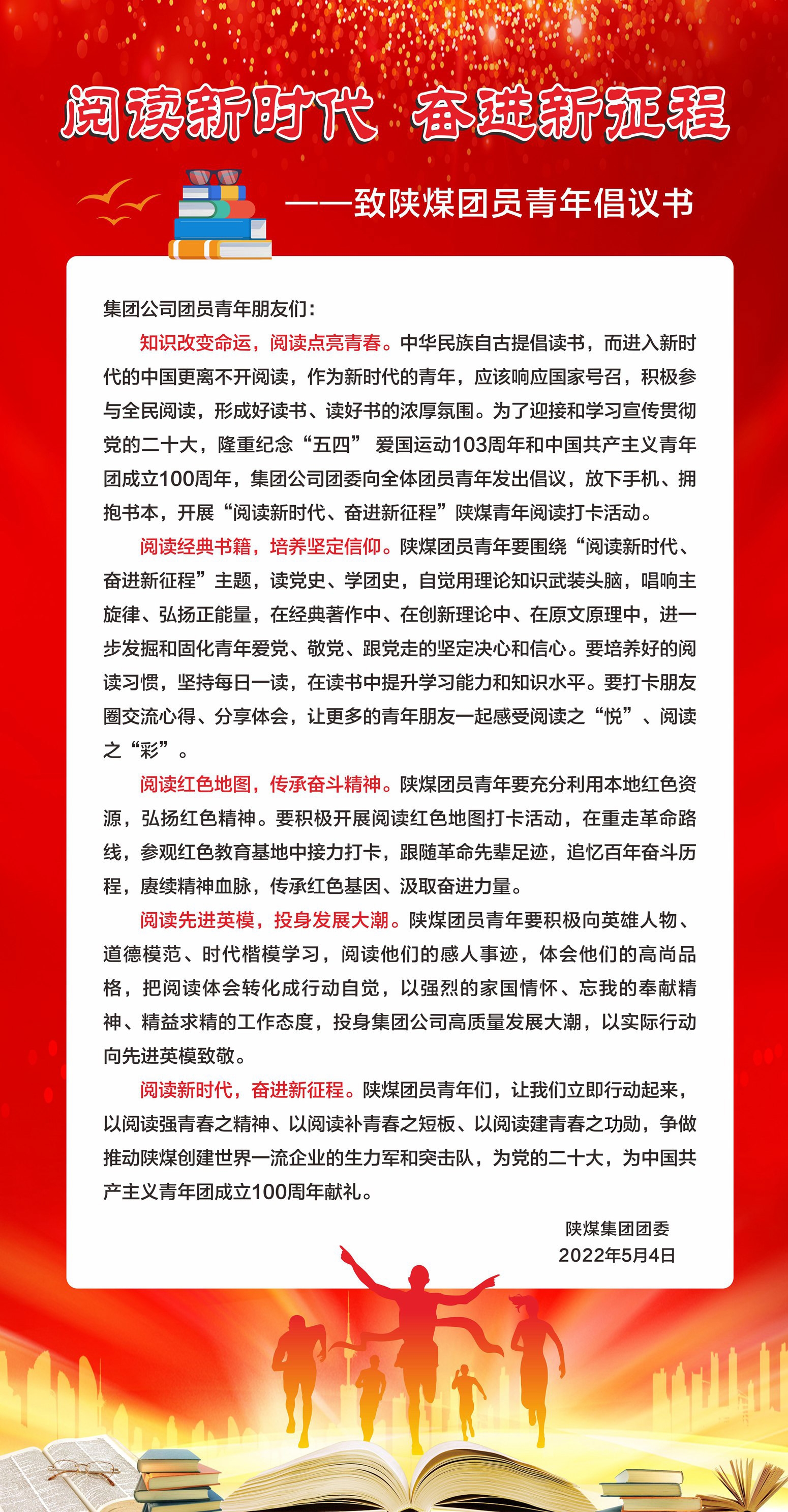 5月10日上午,慶祝中國(guó)共產(chǎn)主義青年團(tuán)成立100周年大會(huì)在北京人民大會(huì)堂隆重舉行,中共中央總書記、國(guó)家主席、中央軍委主席習(xí)近平在會(huì)上發(fā)表重要講話。陜煤集團(tuán)總部團(tuán)員青年觀看大會(huì)直播陜煤集團(tuán)團(tuán)委分級(jí)組織所屬907個(gè)團(tuán)支部,7400余名團(tuán)員,12000余名青年集中收看了大會(huì)直播,并迅速圍繞學(xué)習(xí)貫徹習(xí)近平總書記重要講話精神,開(kāi)展學(xué)習(xí)分享、交流研討等活動(dòng)。蒲白礦業(yè)公司團(tuán)員青年觀看大會(huì)直播曹家灘礦業(yè)公司團(tuán)員青年觀看大會(huì)直播韓城礦業(yè)公司團(tuán)員青年觀看大會(huì)直播陜北礦業(yè)公司團(tuán)員青年觀看大會(huì)直播陜煤供應(yīng)鏈公司團(tuán)員青年觀看大會(huì)直播在學(xué)習(xí)...