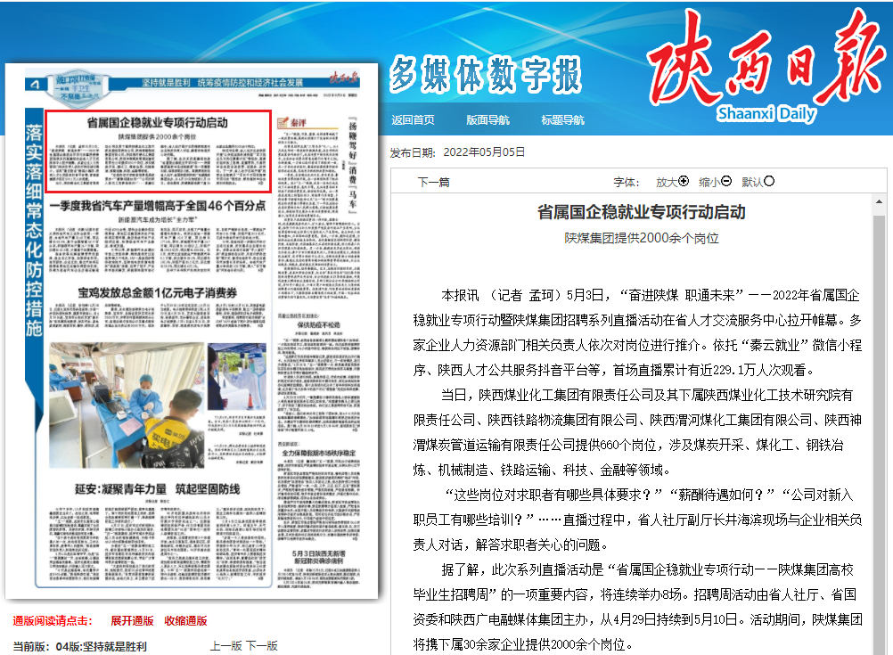 陜西日?qǐng)?bào) | ?省屬國(guó)企穩(wěn)就業(yè)專項(xiàng)行動(dòng)啟動(dòng) 陜煤集團(tuán)提供2000余個(gè)崗位