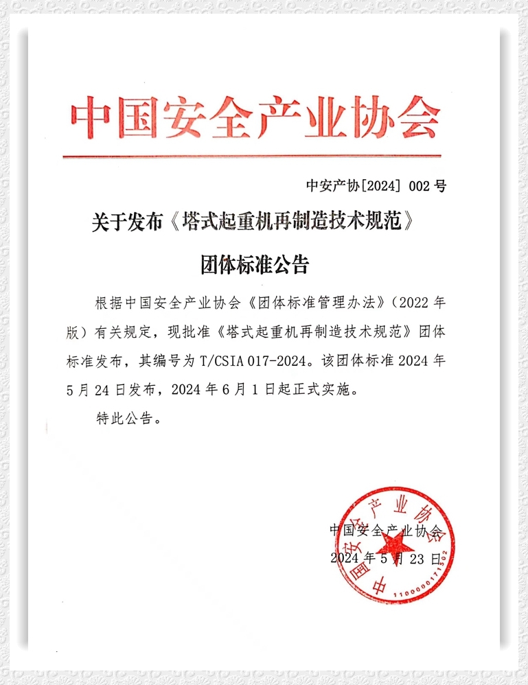 On May 23, the China Safety Industry Association issued a notice approving the release of the group standard of the "Technical Specification for Tower Crane Remanufacturing" (hereinafter referred to as the "Specification") jointly researched and compiled by Shanghai Pangyuan Machinery Leasing Co., LTD and Nanjing University of Technology, number T/CSIA017-2024, which has been officially implemented since June 1, 2024.With the large-scale development of modern engineering proj...